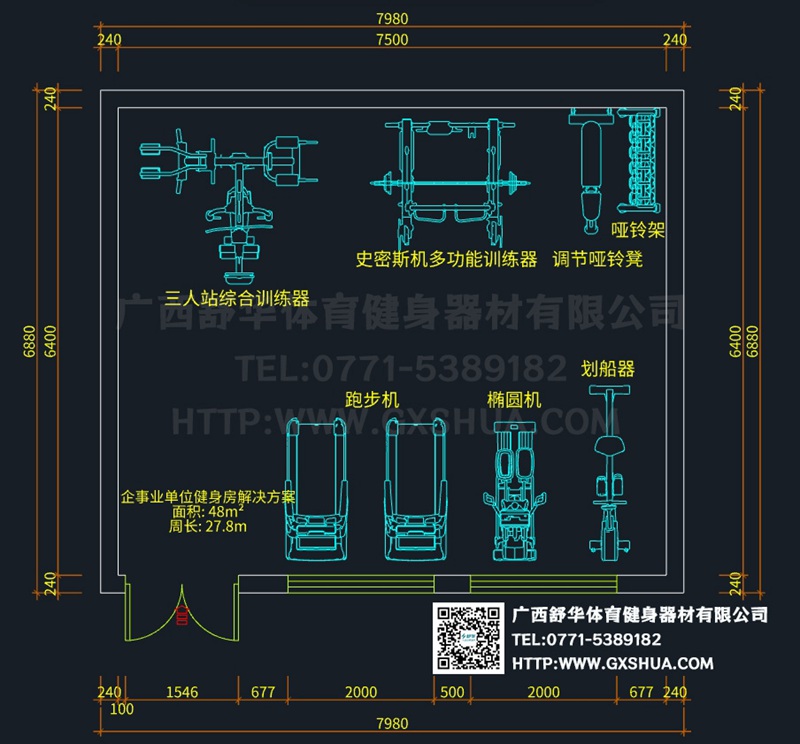 企事业单位健身房是员工健康的守护站。久坐、长期面对电脑等工作模式容易引发各种健康问题,而健身房里的专业设备和训练空间,可以帮助员工预防和缓解诸如颈椎痛、腰椎间盘突出、肥胖等问题,提高身体的柔韧性、力量和耐力,保障员工以良好的身体状态为单位创造价值。基于这些独特功能,KS体育为这个48m² 的小型企事业单位健身房设计了如下配置方案。