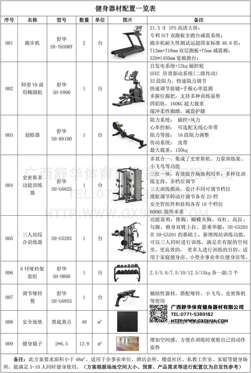 此方案要求面积小于48m²,适用于企事业单位、酒店会所、楼盘社区、私教工作室、家庭等健身场所,能满足5-10人同时健身使用。(方案根据场地空间大小、预算、产品需求等进行配置仅为启发性参考)