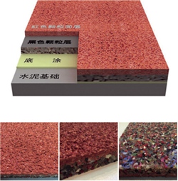 混合型塑胶跑道产品特点: 混合型塑胶跑道由全PU掺杂部分橡胶颗粒为底层,聚氨酯颗粒与塑胶浆为面层铺设组成的高性能塑胶结构。它是国际田联认可的运动场地,可全天候使用,雨后能立即使用。 混合型塑胶跑道具有环保、全天候使用、弹力好、冲击力吸收、耐候性、耐磨性、耐压缩、抗钉力、耐冲击、平坦性、粘接性等特点、实用性强、日常维护简单易行。混合型塑胶跑道价格适中,适合各级标准比赛、训练体育运动馆、各大群体活动运动场。 适用范围: 各级各类学校及体育场、田径场跑道、全民健身路径、室内体育馆训练跑道、游乐场道路铺面。